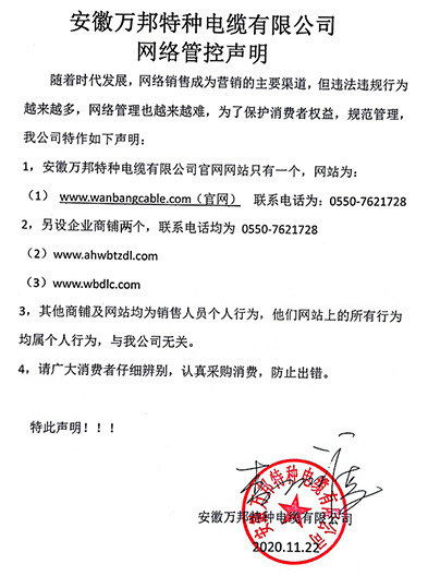 鄭重聲明:安徽萬邦特種電纜有限公司官方網站為:www_wanbangcable_com.singong.cn,除此之外無任何子網站或合作網站,其余均為假冒偽劣。電話:0550-7621728 13485756353 地 址:安徽省天長市滁州高新技術產業開發區經四路29號